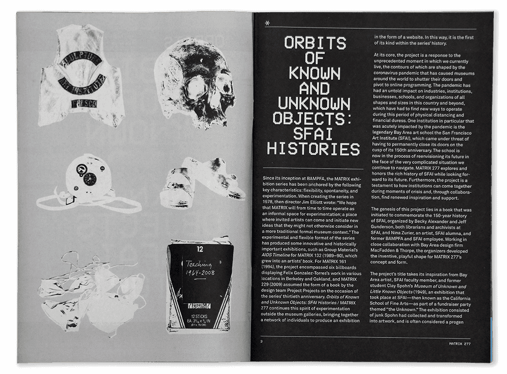Orbits of Known and Unknown Objects: SFAI Histories / MATRIX 277 is an exhibition in the form of a website for the Berkeley Art Museum. In honor of the San Francisco Art Institute’s 150th Anniversary, we worked with SFAI librarians and archivists Jeff Gunderson, Becky Alexander, and Nina Zurier, along with curator Apsara DiQuinzio to celebrate the school through a series of objects that speak to the history, community and creative output of this remarkable institution.