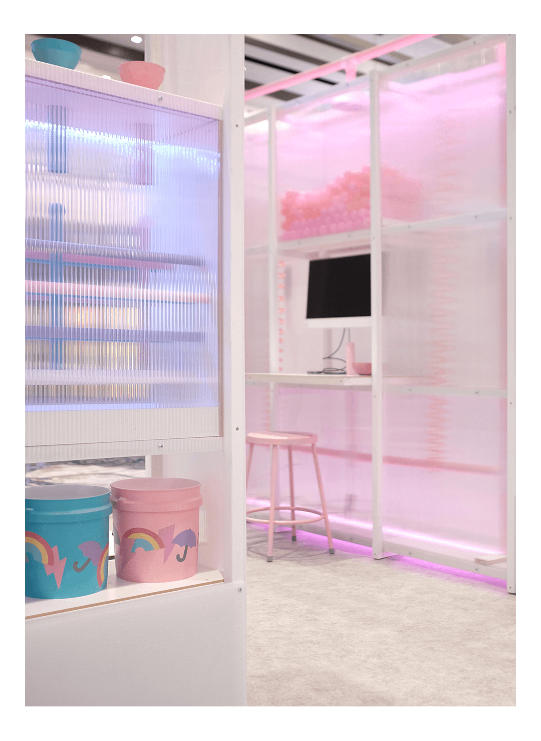 Mindful wanted a laboratory theme for their booth. We pulled from their pastel brand colors to create this soft glowing lab of tubes, cords and balls, providing a handsome home in which Mindful could meet with customers over the course of the show.